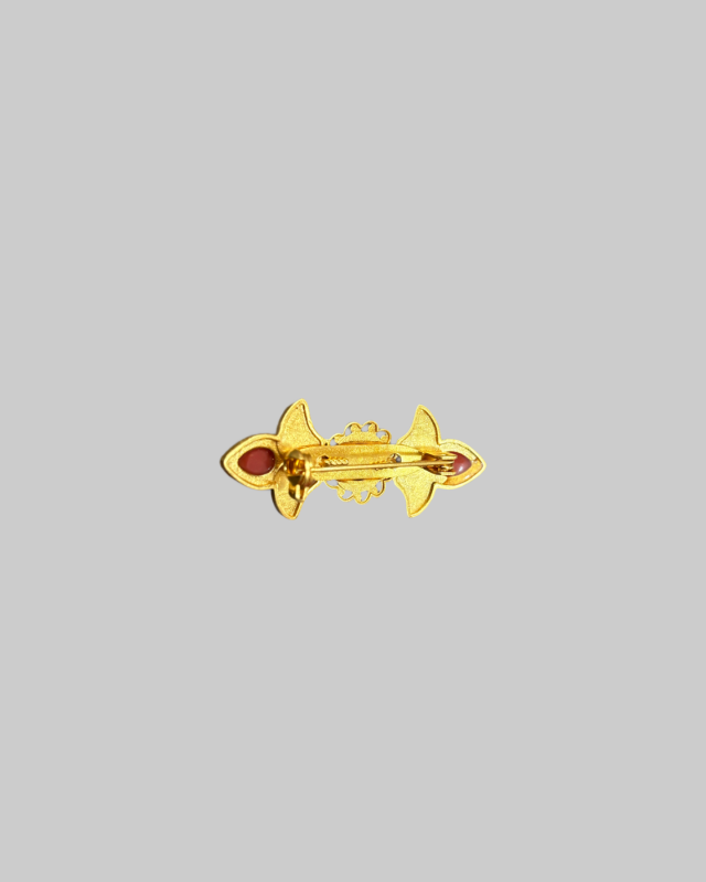 This traditional Tibetan-style brooch showcases a striking combination of red coral and turquoise gemstones set in warm gold-tone metal, reflecting the vibrant and symbolic color palette of Himalayan jewelry. The intricate design is inspired by classic Tibetan metalwork, offering both decorative beauty and cultural resonance.