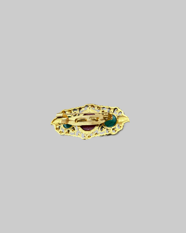 This vintage Czech gold-tone brooch showcases a striking combination of red glass and turquoise cabochon stones set in a warm gold-tone metal frame. The vibrant contrast of colors and the ornate design reflect the elegance of mid-century Czech costume jewelry, celebrated for its craftsmanship and decorative detail.